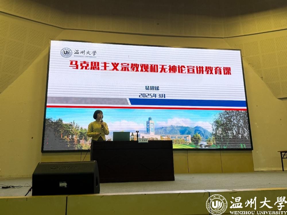 3月25日晚,我院党委书记易招娣在南校区9号楼报告厅为本科生上《马克思主义宗教观和无神论宣讲教育课》。