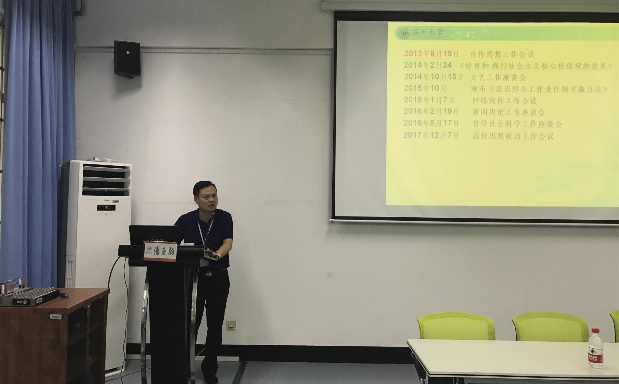2018年6月20日下午,彩票平台 召开教师理论学习会,邀请学校党委委员、党委宣传部部长潘玉驹作题为《牢牢把握意识形态领导权主动权》的主题报告。学院教职工参加了学习会,党总支书记周荣主持。