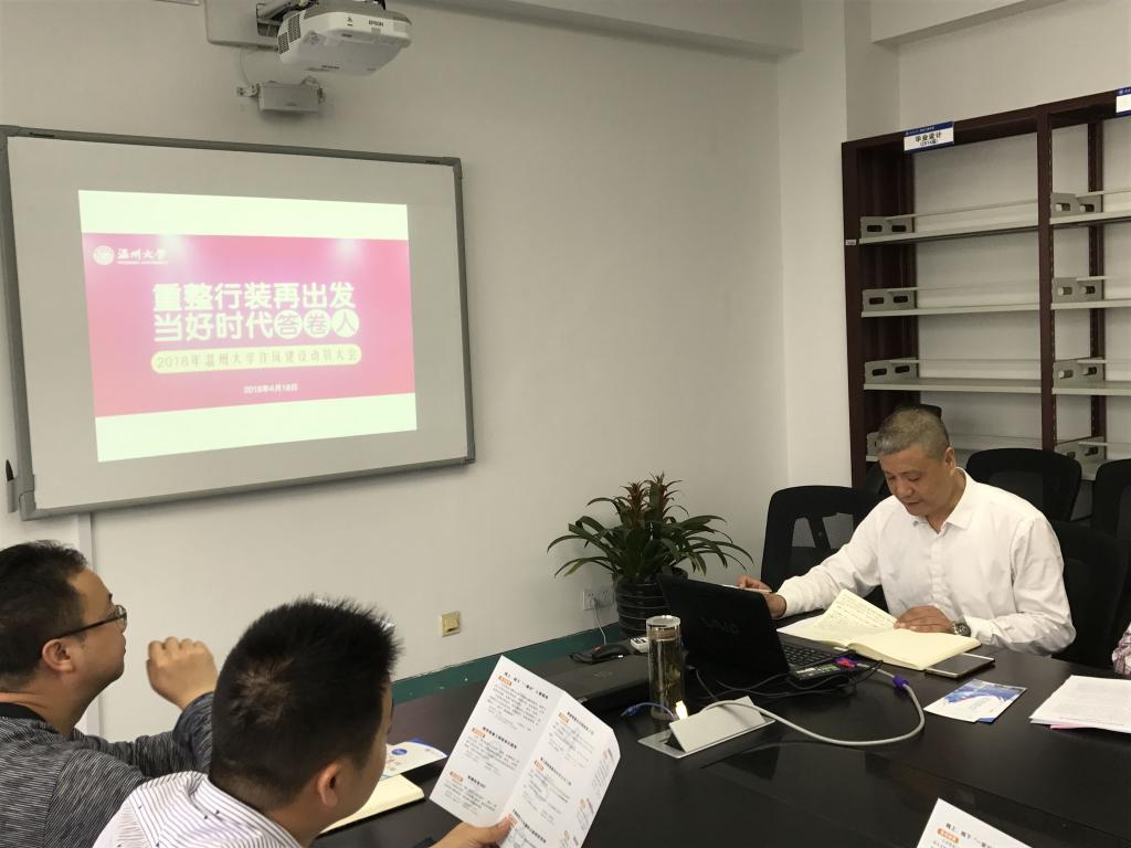 2018年4月23日,彩票平台 召开中层干部工作会议,传达学习2018年温州大学作风建设动员大会会议精神。学院领导班子成员、各系部、中心、研究院、研究所、各科室负责人及全体行政人员参加学习。学院总支书记周荣主讲。
