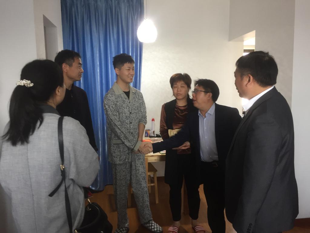 4月18日,学院院长周宏明、步青学区书记姜海燕、学院副书记李密陪同校党委副书记前往上海专程看望学生并将捐款交到维峰父母手里,了解到维峰同学一期的治疗非常成功,接下来即将进行二期的治疗,各位领导鼓励维峰同学要保持良好的心态,配合医生的治疗,并希望他尽快恢复健康,回到学校学习。
