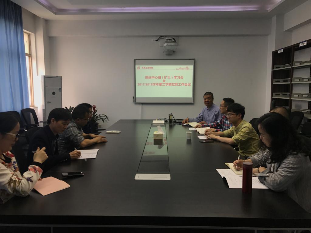 2018年4月12日下午,彩票平台 党总支在6C401召开中心组理论(扩大)学习会,集中学习党的十九届三中全会精神、“两会”精神和学校党务工作会议精神。学院领导、总支委员、各教工支部书记及支部委员参加学习。会议由总支书记周荣主持。