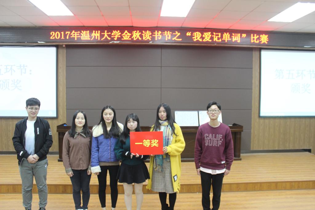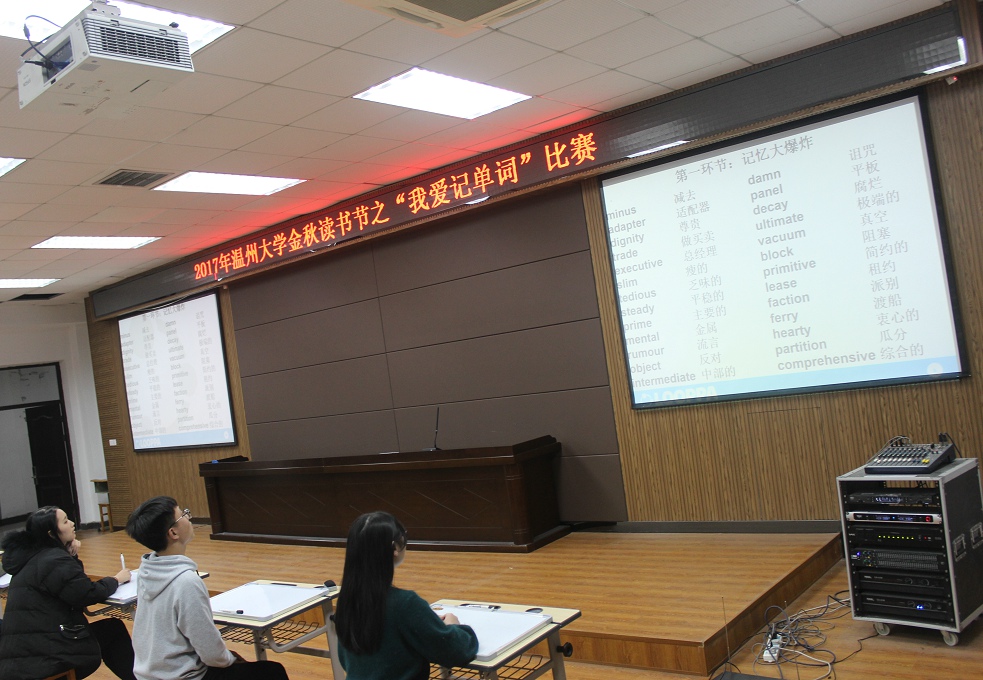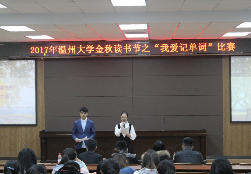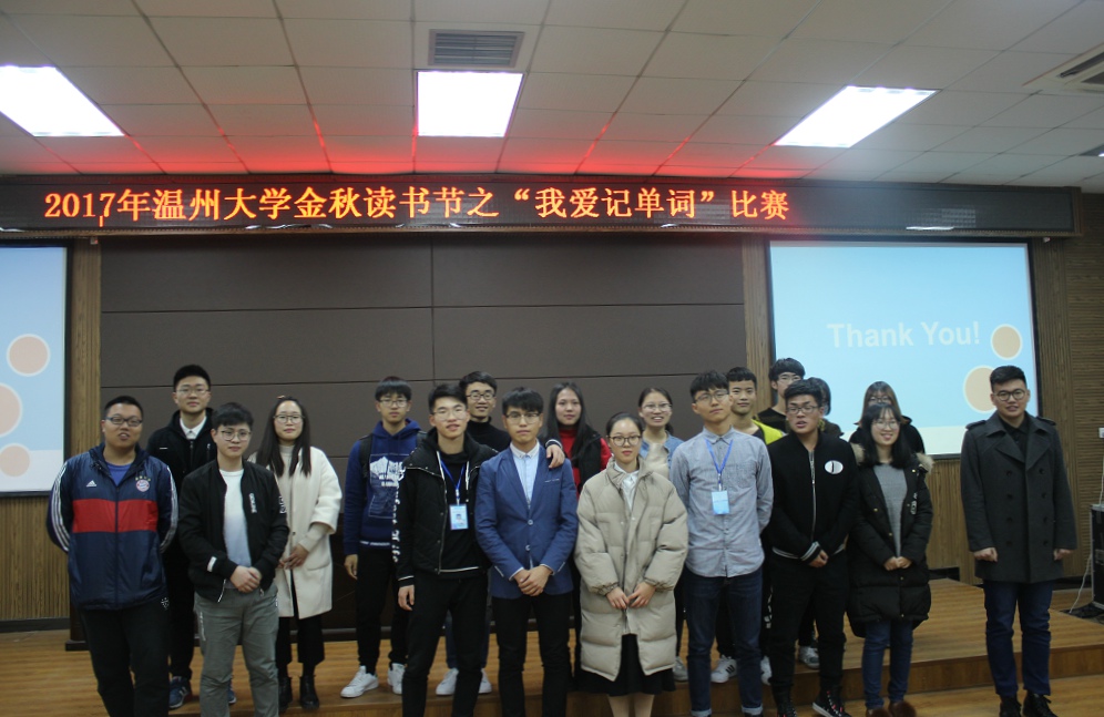 2017年11月24日下午18:30,彩票平台 团委学生会学检部和化学与材料工程学院团委学生会文体部在化学与材料工程学院11C401联合举办了温州大学金秋读书节之“我爱记单词”大赛。出席本次活动的有机电学院团委学生会主席曹瑞涵,副主席周梦莎,化材学院团委学生会主席章林祥,团委副书记刘晓霞,副主席冯志浩及来自温州大学的14支优秀队伍。
