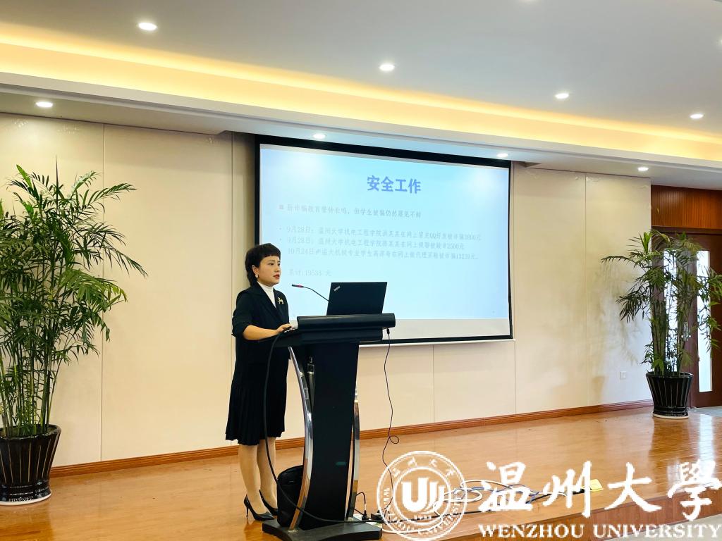 会议由学工办杨奇老师主持,首先杨奇老师代表学工办向全体班主任汇报了新学期学院学生的思想动态研判情况:因为疫情的影响,在家网上学习效率较低,学生学业压力较大;同时,疫情防控还未完全结束,找工作的压力也很大;网络防诈骗工作任重道远。随后,黄玮老师从学院角度,分析了从开学到现在发生的一系列学生突发事件,希望和班主任一起做好学生日常的管理工作,对于学生出现的情况早发现、早干预、早处置。最后,杨奇老师向与会的班主任介绍了辅导员的工作分工,以便更好的服务学生成长、服务班主任的管理工作,同时也通报了接下来学生工作的主要内容。
