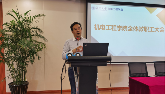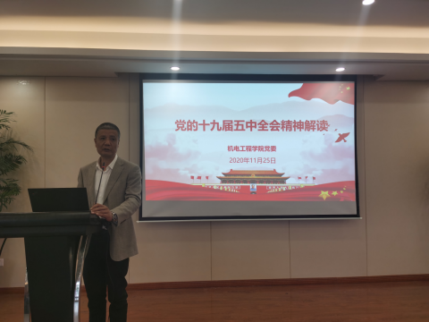 11月25日下午,机电学院党委召开了全院教职工大会,集中学习领会中共十九届五中全会精神,部署学院下一阶段的工作,会议由学院党委书记周荣主持。