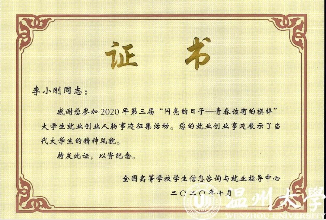近日,教育部高等学校学生信息咨询与就业指导中心公布了2020年第三届“闪亮的日子——青春该有的模样”大学生就业创业人物事迹征集名单,我校彩票平台 2019届硕士毕业生李小刚成功入选创业人物,浙江省仅5人入选该名单。