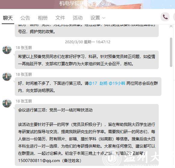 近日,彩票平台 研究生党支部开展了“考研结伴行,大疫人有情”为主题的党员一对一帮扶活动,主要对参加考研同学进行与答疑与经验分享,研究生党支部党员及积极分子等20多名同志,踊跃投入到此次一对一帮扶活动当中。