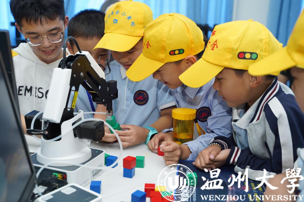 温州大学城附属学校学生先后参观了学院Dobot机械臂实验室、虚拟教学(VR)实验室和机器人模拟室。同学们观察了3D打印过程、开展了人机五子棋比赛和虚拟现实(VR)体验等,最后参观了学生科技成果展示厅,同学们对这些科技成果展现了浓厚的兴趣,还纷纷在展厅的荣誉墙前合影。