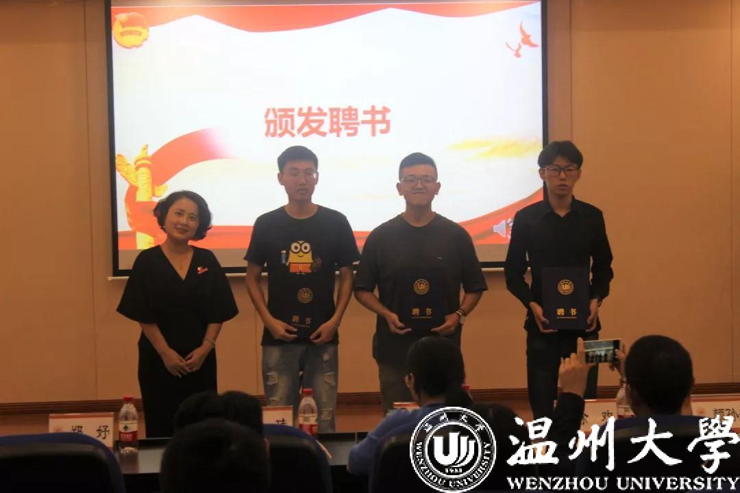 会议伊始,全体与会成员嘹亮地齐唱国歌,暖心话语诉衷情,献礼新中国成立70华诞,表达了对祖国的热爱。随后,我院党委书记黄玮老师发表讲话,学生干部是学院学生工作的主力军,是联系学院与同学的桥梁和纽带,也是引领其他同学努力上进的榜样。学生干部必须发扬责任与担当、服务与奉献、团结与合作精神,明确新目标,创造新辉煌。接着,团委书记朱秀微老师为大家讲解了团委·学生会工作规划并表达了对团委·学生会的希冀。“去年我院男子组在校运会上勇夺第一”、“我院团委荣获温州市五四红旗团委”,当听到这些时,每一位团学成员再也藏不住内心的喜悦,团委副书记沈锐博的一番话让团学成员们看到了一个积极向上、团结的组织,并因加入这个组织而感到自豪,告诉了每一位新生今后应有绝对认真的工作态度、提升自我的想法以及服务同学的观念。让大家感受到了他们对团学工作的热情与新学期的希望。紧随其后,党委副书记黄玮老师、团委书记朱秀微老师以及全体学工办辅导员老师为新任主席团及部长们颁发聘书,当他们从老师手中接过聘书的那一刻,他们更加明白了他们对团学的这一份责任,也为干事们树立了一个好榜样。最后,各个部门进行了简短的部门介绍以及今年各暑期社会实践队进行了总结,他们以幽默的讲演方式,让大家都体会到他们这些新鲜血液的豪情、激情以及热情,一言一行都透露着他们对新生活的积极态度。