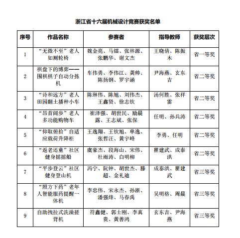 2019年5月24—5月26日,浙江省第十六届大学生机械设计竞赛决赛在浙江海洋大学举行,本届竞赛以“智慧养老、情暖夕阳”为主题,以“以居家养老和提升老年人生活品质”为目的,涵盖室内外生活、休闲(含娱乐)、阅读(含视听)、锻炼(健身养生)、出行(包括上下楼梯)、购物等机械创新设计与制作。竞赛共吸引了包括浙江工业大学、温州大学、宁波大学等省内51所高校的438支队伍参加。