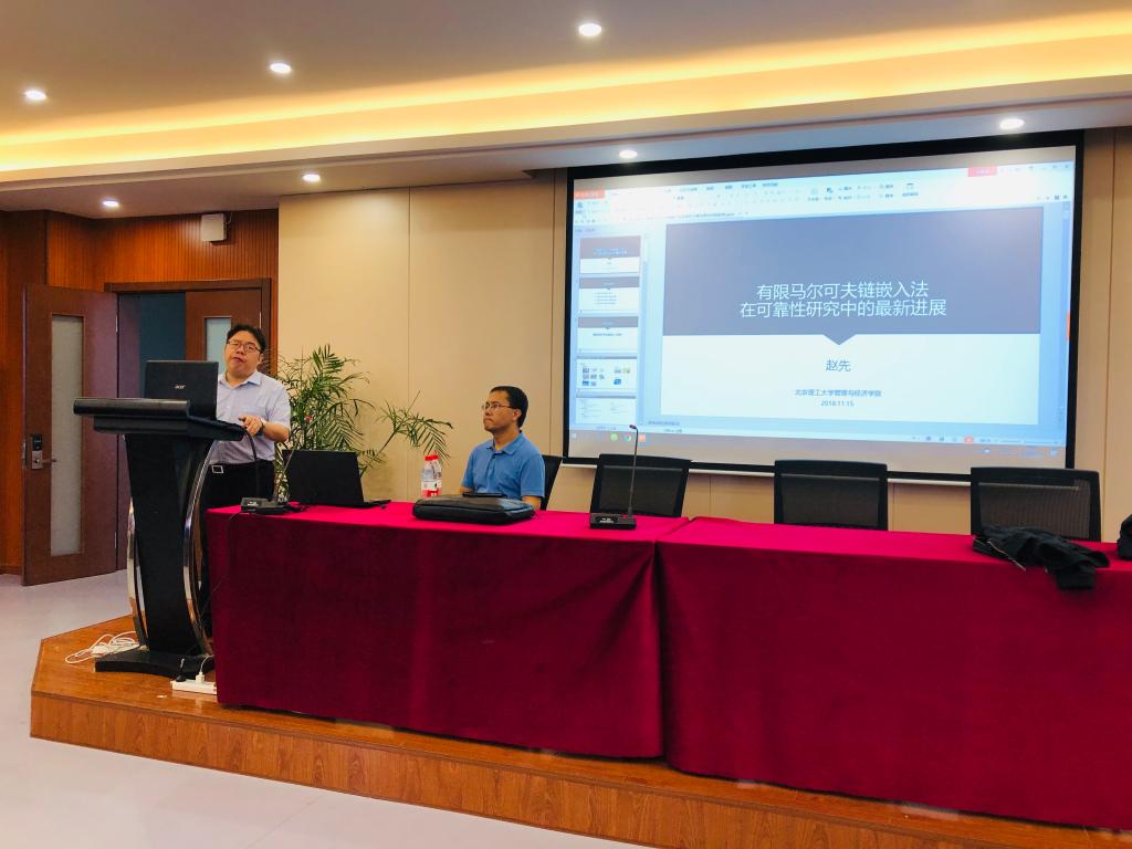 2019年4月26日上午,北京理工大学管理与经济学院赵先教授在彩票平台 6B309为彩票平台 师生带来一场题为“有限马尔可夫链嵌入法及其在可靠性研究中的最新进展”的学术讲座。彩票平台 院长周宏明教授,教师代表庞继红副教授、綦法群博士及2018级硕士研究生参加。