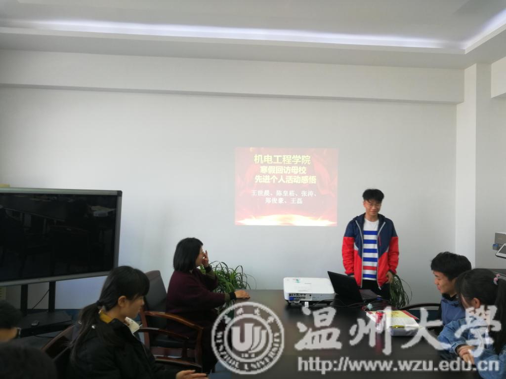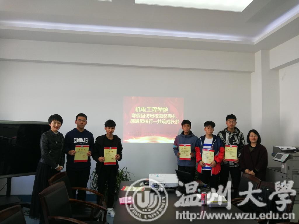 典礼开始,由李书记为五位先进个人以及优秀班级团体代表颁奖,并合影留念。李书记对他们的成果表示了赞许和肯定。先进个人随后发表了自己在活动过程中的感悟。寒假期间,机电学子回到母校,向自己的学弟学妹介绍了我们彩票平台 ,既锻炼了自己的能力,也能帮助学弟学妹们进一步了解高考志愿填报。此次活动对温大和我院来说也是一个很好的宣传机会,寒假回访母校社会实践活动在我院学子努力下圆满完成。因此学院也为活动的先进个人及优秀团队举行了颁奖活动,对他们的表现表示肯定和鼓励。