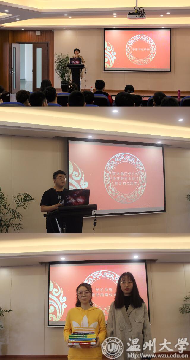 经过主持人一番开场白后,首先,由16年级委员会主席黄本鑫同学介绍考研教室申请过程和相关制度。他希望同学们能够珍惜当下学习机会,并加强安全意识,爱护学院提供的考研学习场所。接下来是学长学姐图书捐赠仪式,15卓工2班班长周榕同学代表已参加完研究生入学考试的同学们向16级考研同学们捐赠了一系列考研书籍,传递着他们的考研精神和对学弟学妹们殷殷的祝福。