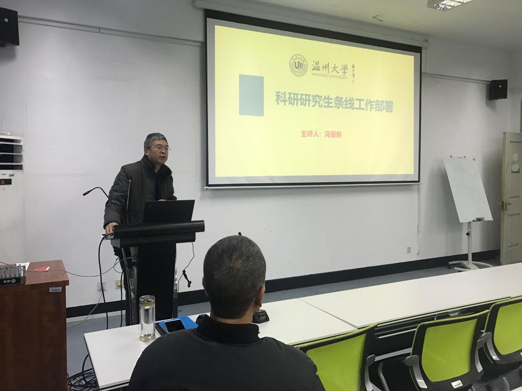 冯爱新副院长就科研、研究生条线工作进行了部署。他首先公布了温州大学—浙南科技城激光光电智能制造研究生联合培养基地入选2018年浙江省研究生联合培养基地的喜讯。随后,就专业学位研究生培养环节中的企业实践问题,冯爱新副院长着重进行了说明,他要导师高度重视,并且要签订研究生培养基地协议。