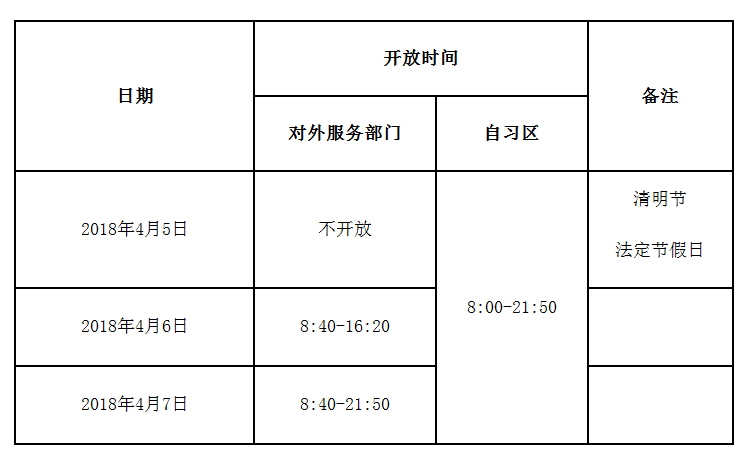 根据本学期校历表安排,图书馆清明节期间对外服务时间安排如下: